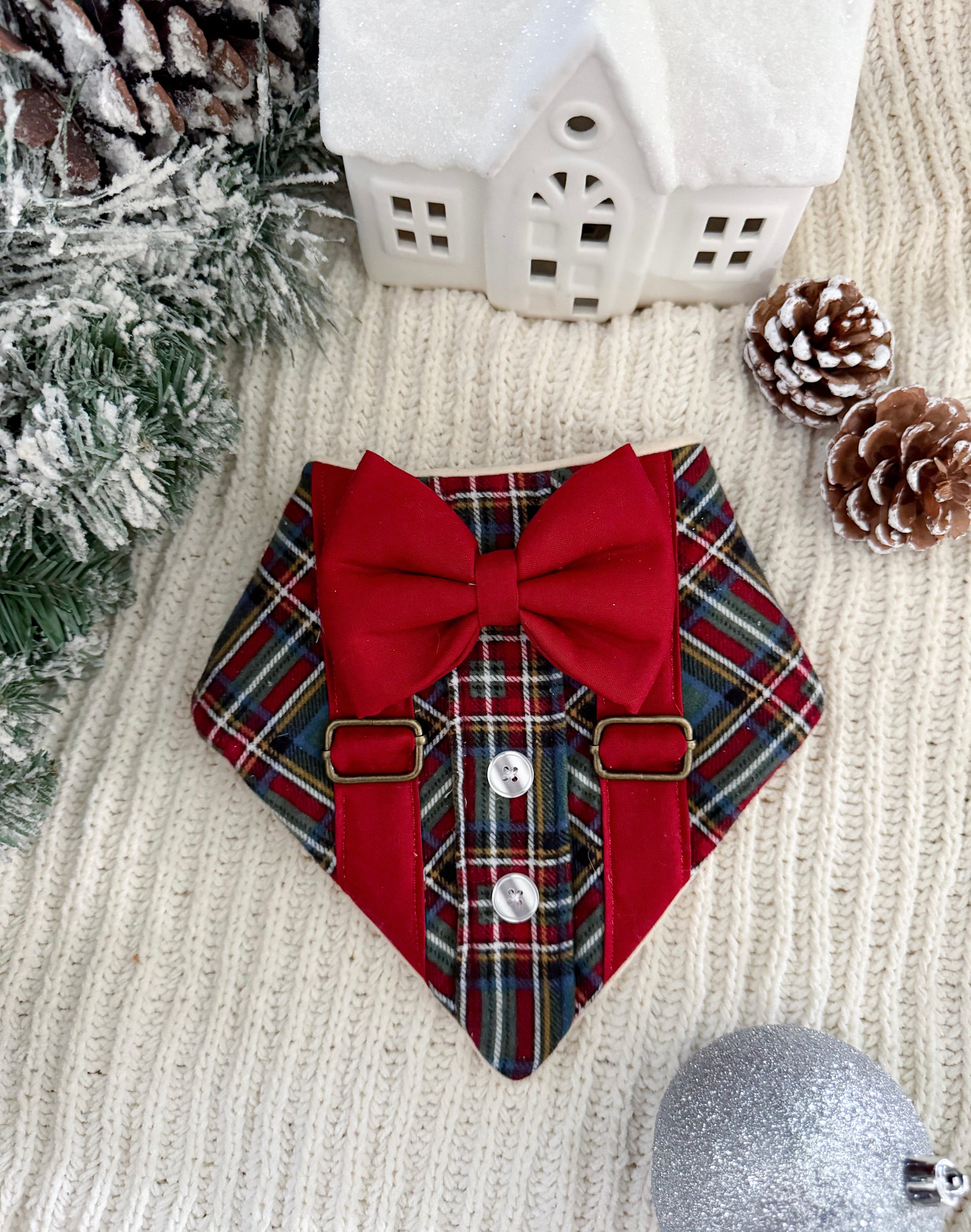 Product Disclaimer: The bandanas, collars, bow ties, and all other products are not meant to be chewed or played with. Please supervise your dog when wearing our products as it may cause choking or suffocation if left unattended. We are not responsible for damaged accessories caused by your pet or owner's misuse of our products.